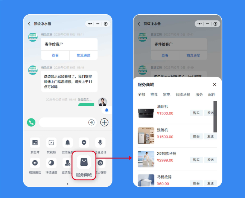 微售后商城打破这个壁垒。客服在与用户聊天时,可直接在对话框推送相关商品链接——比如用户问净水器滤芯怎么换,顺手推一个原厂滤芯购买页。用户无需跳转,一键下单。把每一个咨询都变成成交机会,成交路径最短化。