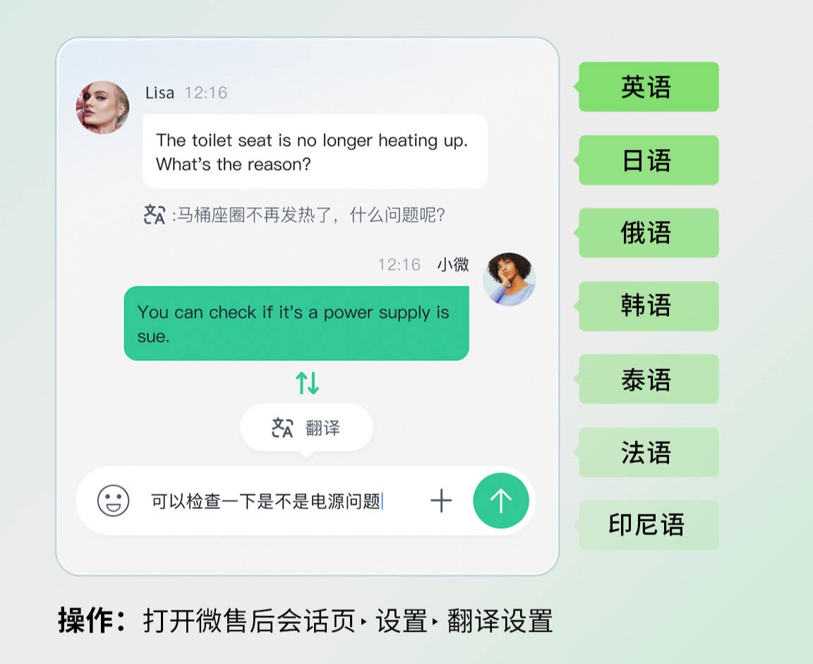 现在,微售后已支持英、日、俄、韩、印尼、泰、法等多语种的实时互译。